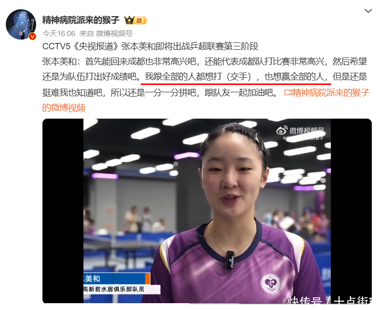 濒临行将与宇宙第一孙颖莎的交手契机,张本好意思和袭取央视采访放出豪言:“我要跟全部的东说念主都思打,也思赢下全部的东说念主,但是如故挺难我也知说念吧,是以如故一分一分拼吧,跟队友沿途加油!”