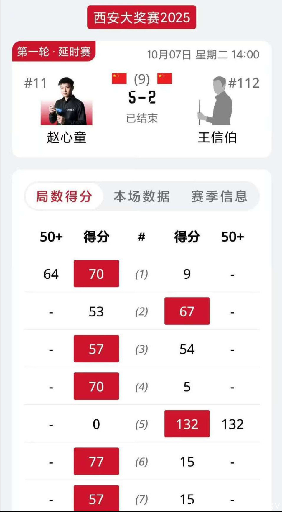 北京时候10月8日讯息,2025年斯诺克西安大奖赛负责开杆。首个比赛日的一场中国德比战中,本年世锦赛冠军赵心童带病出战,他以总比分5-2完胜17岁的外卡选手王信伯,强势开启冲冠之旅。