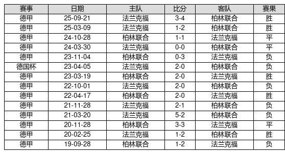 柏林纠合 VS 法兰克福两队近10年的交战次数为14场,柏林纠合5胜3平6负,赢球概率为35.7%,平局概率为21.4%,输球概率为42.9%。