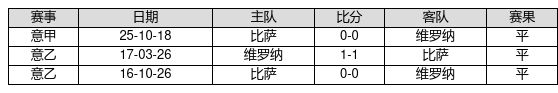 维罗纳 VS 比萨两队近10年的交战次数为3场,维罗纳0胜3平0负,赢球概率为0.0%,平局概率为100.0%,输球概率为0.0%。