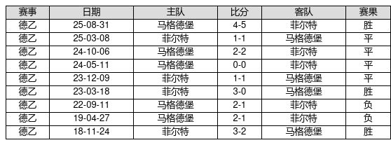 菲尔特 VS 马格德堡两队近10年的交战次数为9场,菲尔特3胜4平2负,赢球概率为33.3%,平局概率为44.4%,输球概率为22.2%。