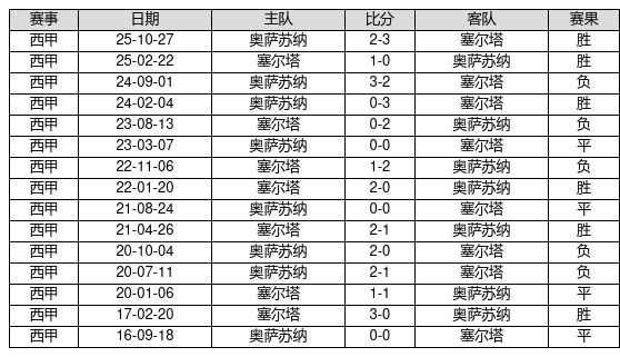 塞尔塔 VS 奥萨苏纳两队近10年的交战次数为15场,塞尔塔6胜4平5负,赢球概率为40.0%,平局概率为26.7%,输球概率为33.3%。